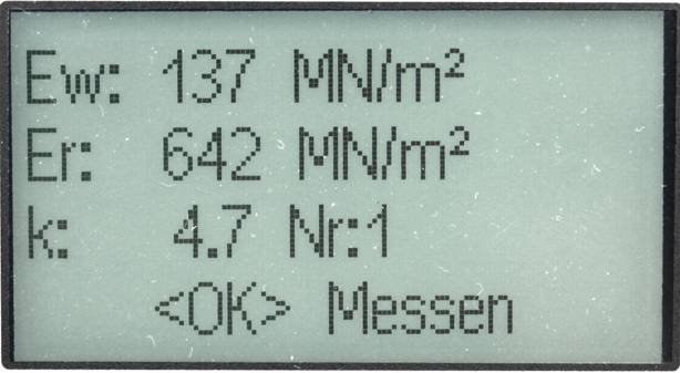 Die Auswertung der Messung erfolgt nach “Müller”. Es werden die äquivalenten Verformungsmodule E ä,W (äquivalenter E-Modul des Untergrundes) und E ä,R (äquivalenter E-Modul des Asphalts) berechnet. Aus dem Steifigkeitsverhältnis k (E ä,R / E ä,W ) lassen sich Rückschlüsse auf die Qualität des Untergrundes und der Asphaltschicht ziehen: