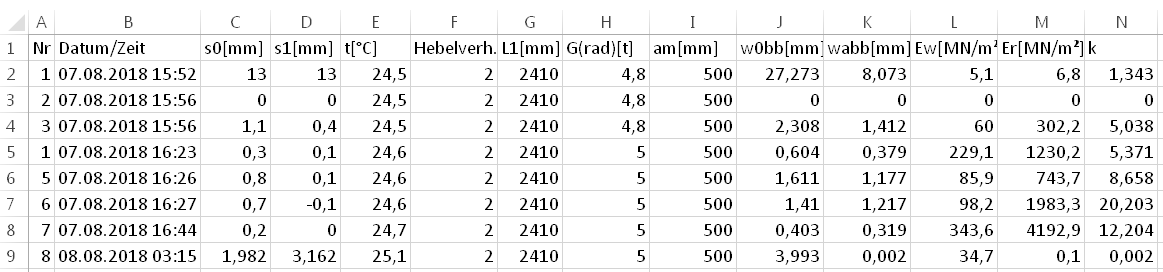 The measurement is evaluated according to the Müller method. The equivalent deformation moduli E e,W (equivalent modulus of elasticity of the subgrade) and E e,R (equivalent modulus of elasticity of the asphalt) are calculated. The stiffness ratio k (E e,R / E e,W ) can be used to draw conclusions about the quality of the subgrade and the asphalt layer: