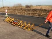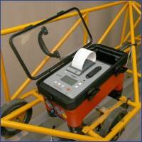 The planograph is used to determine the evenness of the pavement along the lane. The device records deviations concentric below a 4 m beam. It consists of a frame with 10 wheels, one carrying wheel, one measuring wheel and a towing bar. The tester pulls the planograph along the lane. Simultaneously the covered distance and the vertical movement of the measuring wheel are recorded on the SD-card. On exceeding of the limiting value – normally 4 mm – a warning signal resounds and the data is recorded seperately for the evaluation (p and p²). The electronics is situated in a robust waterproofed housing which is fastened at the planograph by a rubber cord. The evaluation of the section takes place automatically at the end of the measurement and can be printed by the built-in mini-printer. In order to edit the data on the PC you can use the Excel-template which is included. The complete surface-profile can be printed.